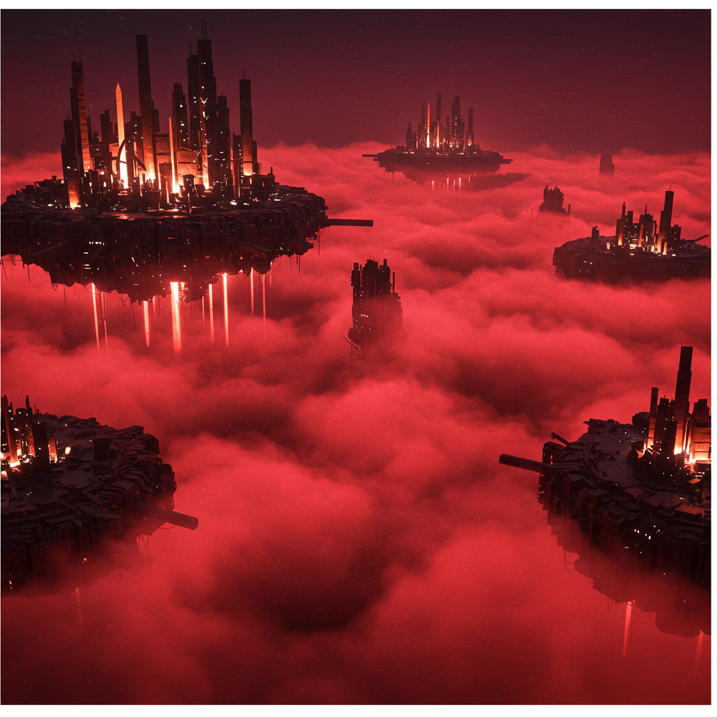 활용 프롬프트: 하늘을 나는 고대 도시, 붉은 안개와 금빛 탑들로 가득 찬 초현실적 풍경을 그려줘